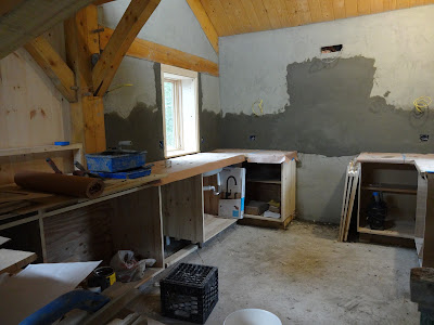 On the inside, a couple of big things are new: we now have base cabinets and plumbing. Yes! Running water and everything! We could even take a very cold shower at the new house! It is beginning to look more and more like a house!